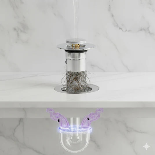 AquaBlock retiene cabellos, pelusas y pequeños residuos antes de que bloqueen el desagüe. El agua fluye rápido, sin estancarse, y tu lavabo se mantiene limpio por mucho más tiempo. Ya no necesitas desmontar el sifón ni usar productos químicos agresivos. AquaBlock hace el trabajo por ti, de forma continua.