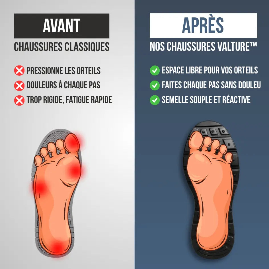 Marre des chaussures qui serrent, sacrifiant votre confort et laissant vos pieds endoloris avant même la fin de la journée ? Les Chaussures Ultra-Confort Valture™ révolutionnent votre quotidien : leur boîte à orteils généreuse libère vos doigts naturellement, leur semelle orthopédique à double densité absorbe chaque impact, et leur maille respirante garde vos pieds frais et secs en toutes circonstances. Dites adieu aux douleurs et à la fatigue !